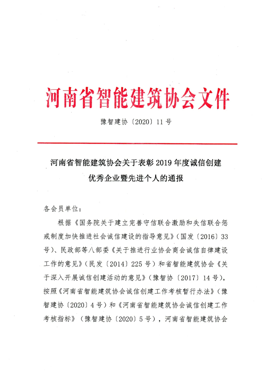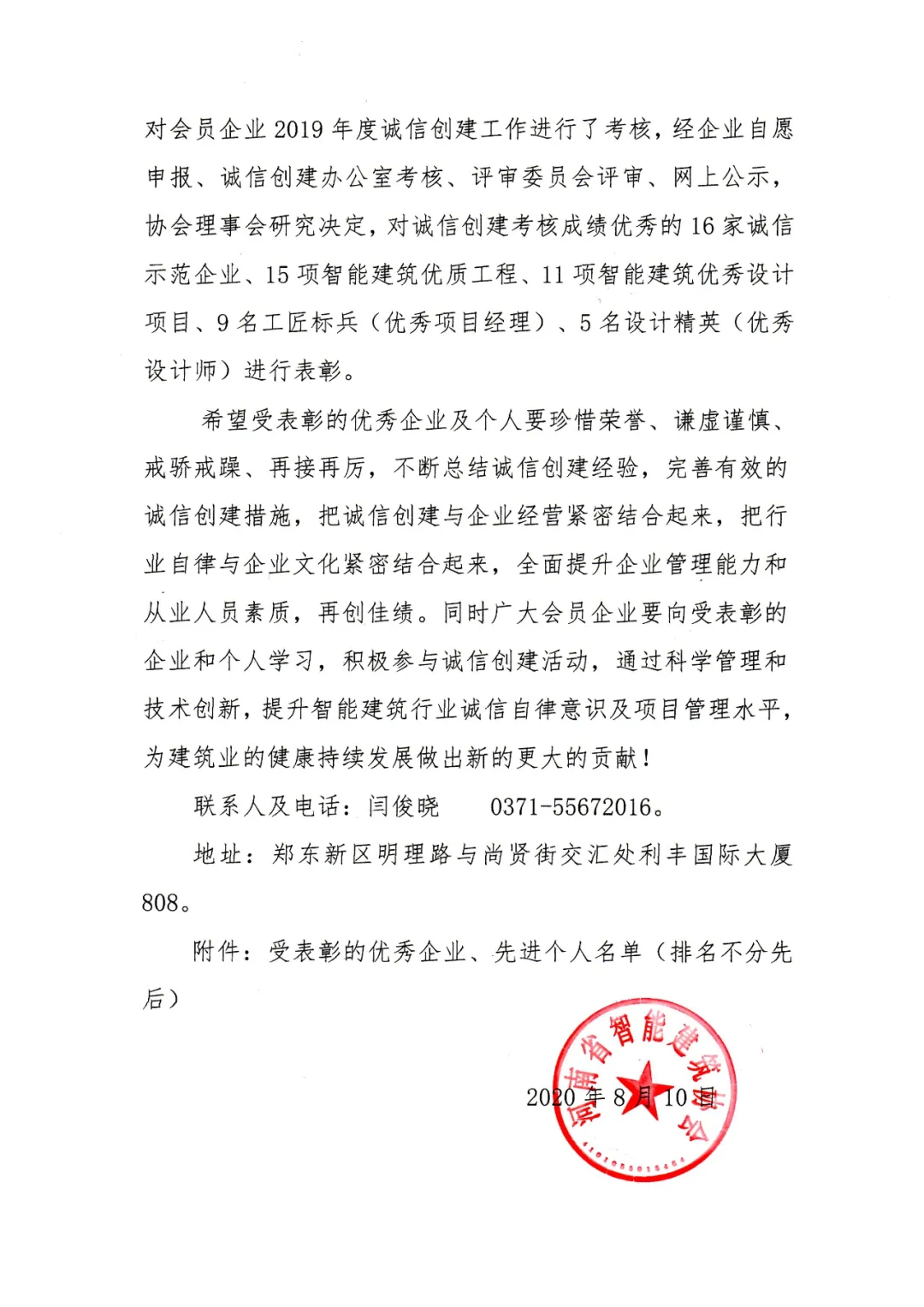 “评选”燃情,技能筑梦。兰亭建设有限公司自成立以来一直坚持以“诚信”为先,安全为本,质量第一做为企业经营理念。在2020年被河南省智能建筑协被评为“2019年度诚信示范企业及智能建筑优质工程”。